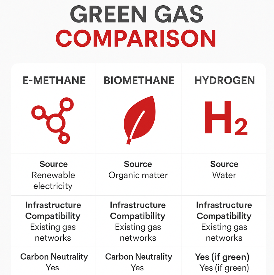 Both biomethane and e-methane are capable of identical operating behaviour when compared to fossil fuels and can therefore be placed into existing infrastructure. Biomethane and e-methane can immediately fulfil the role of fossil fuels without any fracture towards appliance operating efficiency, commercial activity, or societal cohesion.