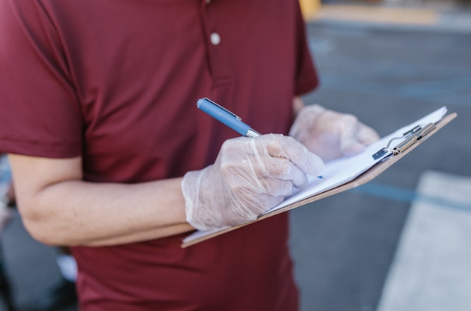 Picture: a photograph of a person writing on a clipboard with a pen. Their hand is gloved in a disposable latex glove. Image Credit: Pexels