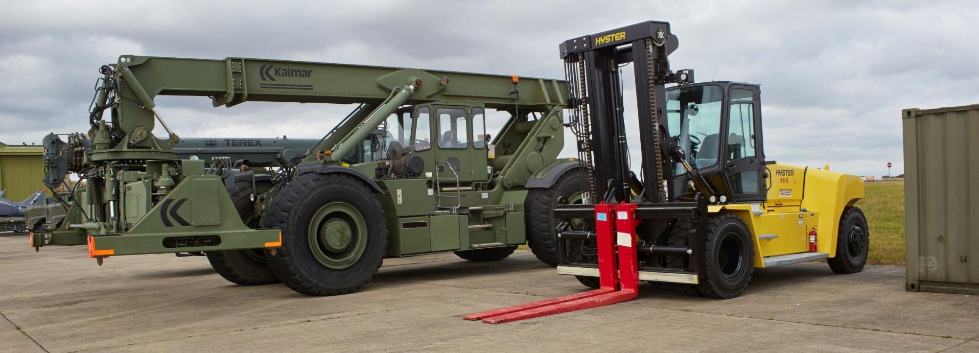 Picture: a photograph of two industrial vehicles: a reach stacker and a forklift, next to a cargo container. Image Credit: Amey