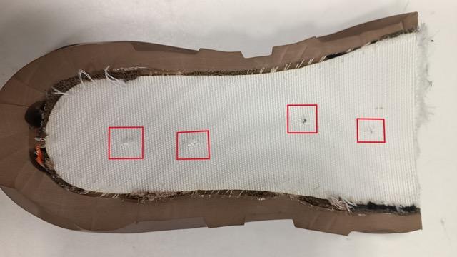 Picture: a photograph showing the soles of the shoes, showing several puncture holes, indicated by red squares. Image Credit: Lewis Collantine, Director of Product Safety Collective Limited