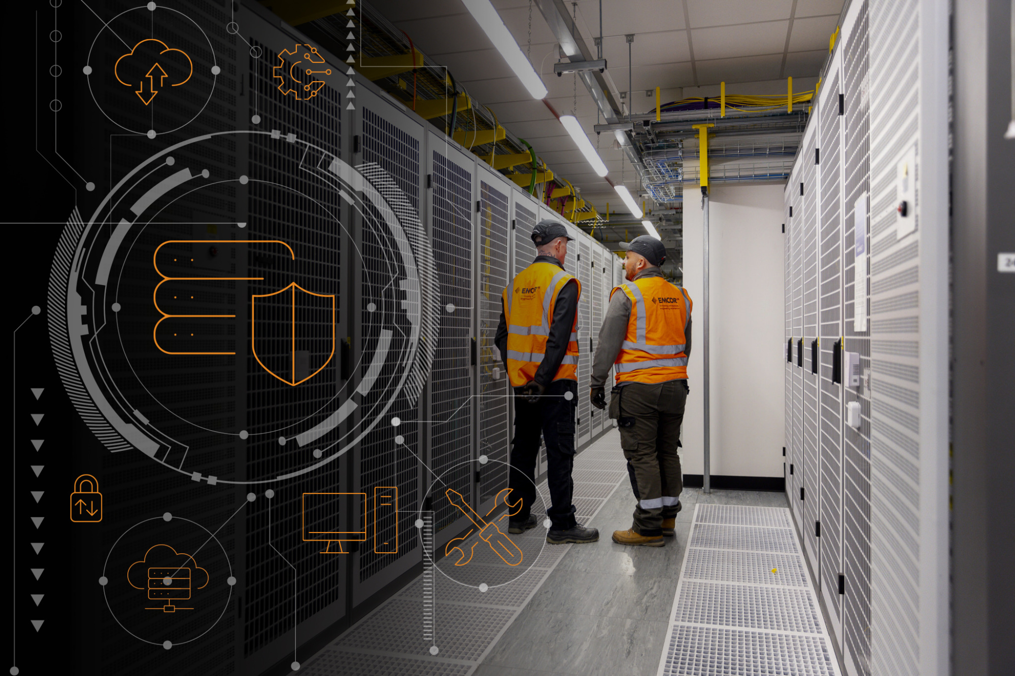 Picture: a photograph showing two engineers wearing hi-vis jackets, standing in an aisle between rows of tall server racks in a data centre. Graphics representing cybersecurity and cloud computing can be seen on the left side of the image. Image Credit: Emcor UK.