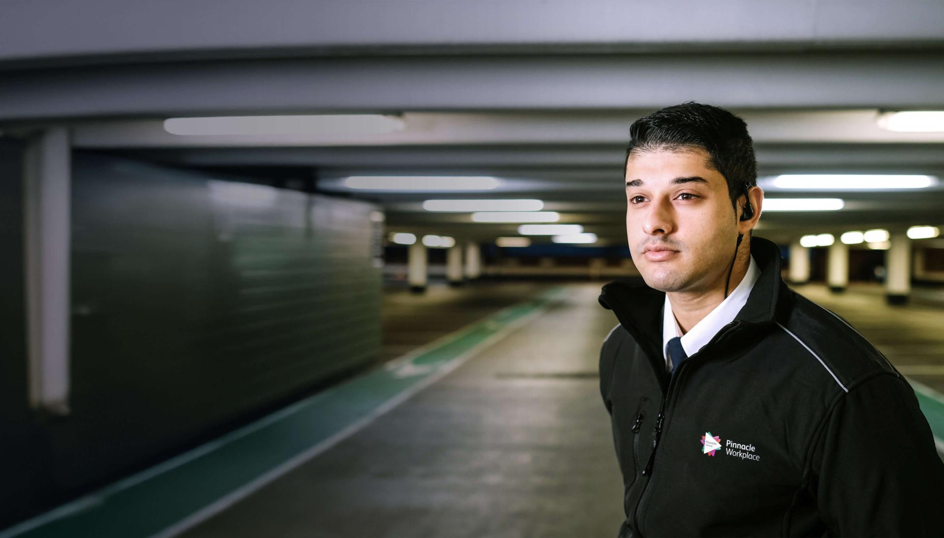 Picture: a photograph of a person wearing a Pinnacle-branded jacket, standing in an indoor car park. The person is wearing an earpiece with a wire. Image Credit: Pinnacle Group