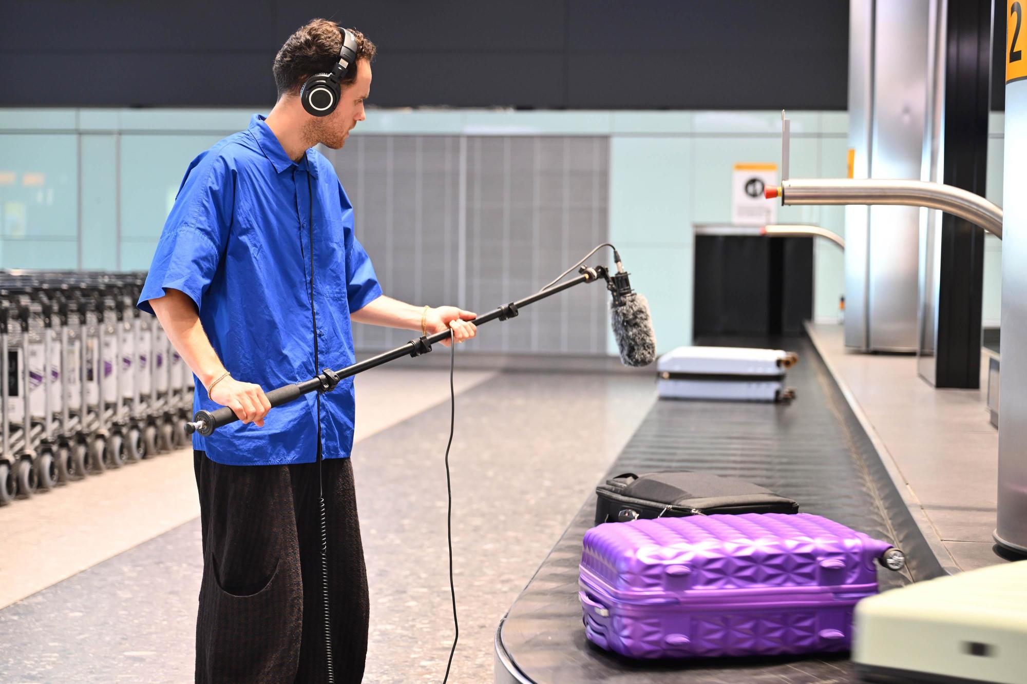 Picture: a photograph of Jordan holding a boom microphone over a suitcase on a baggage carousel. Image Credit: Heathrow Airport