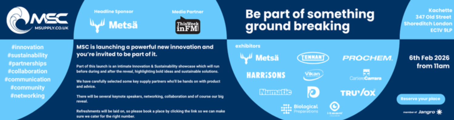 Maintenance Supply Company Ltd (MSC) will host an industry event on Friday 6 February 2026 at Kachette, Shoreditch, bringing together customers, manufacturers and partners for a day focused on sustainability, collaboration and innovation. Guests will have the opportunity to meet leading manufacturers from MSC’s supply network, learn more about the company’s commitment to responsible sourcing and sustainable supply practices, and celebrate the launch of MSC’s new customer support platform, designed to provide faster, smarter and more accessible support. The event reflects MSC’s ongoing investment in service excellence, strong partnerships and future-focused solutions.